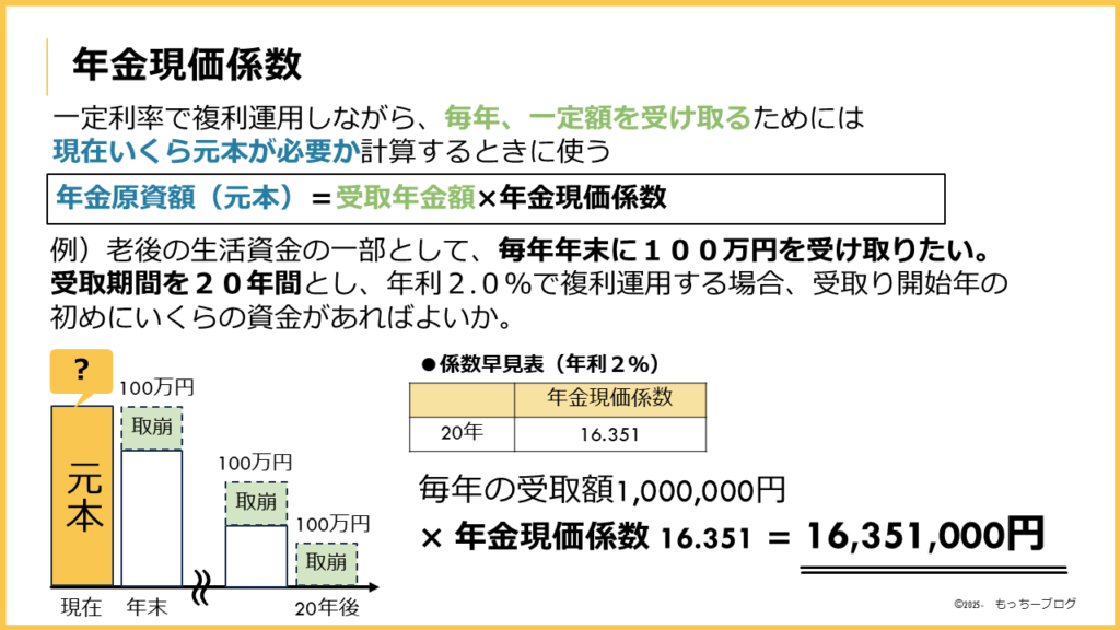 例) 2%の利率で複利運用しながら、今後20年間、毎年100万円を受け取りたい場合、100万円×年金現価係数(20年) 16.351現時点で必要な元本は1,635万円です。