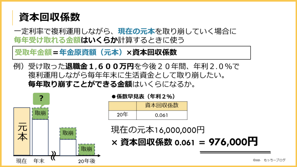 例)受け取った退職金1,600万円を今後20年間、年利2.0%で複利運用しながら毎年年末に生活資金として取り崩す場合、現在の元本1,600万円×資本回収係数(20年) 0.061毎年取り崩すことができる金額は最大で976,000円となります。