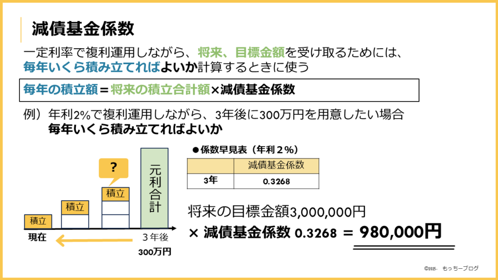 2%の利率で複利運用しながら 3年後に300万円を用意したい場合、300万円×減債基金係数0.3268毎年の積立額は98万円