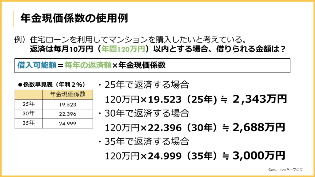 「年金現価係数」は、毎年の返済額から借入可能額を試算するときにも使われます。