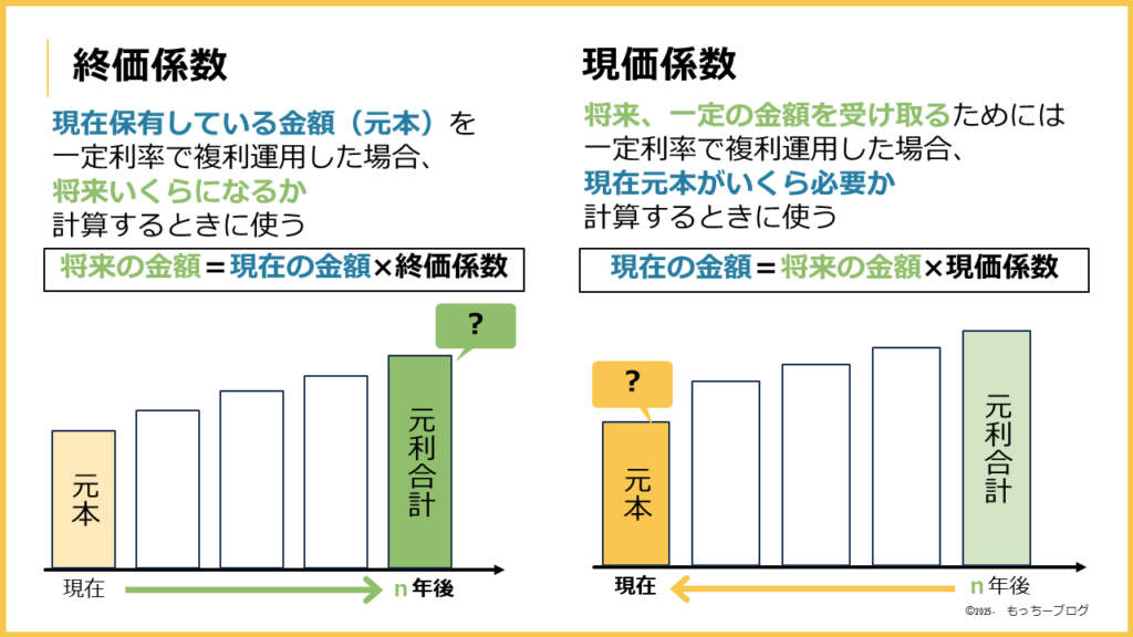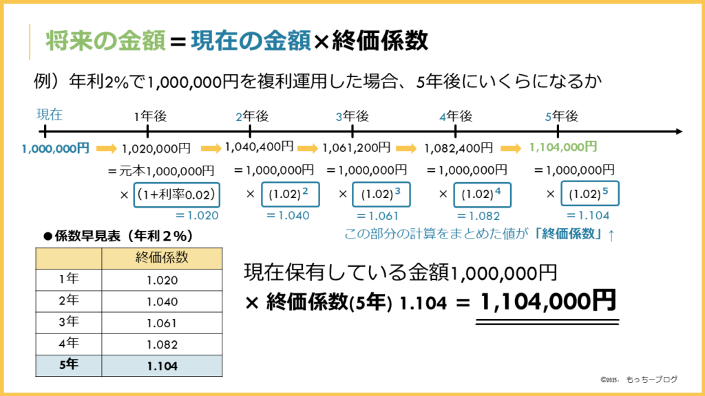 2%の利率で複利運用しながら、5年後の元利合計額を試算したいとき、現在保有する資金(100万円)×終価係数1.104=110万4千円のように使います