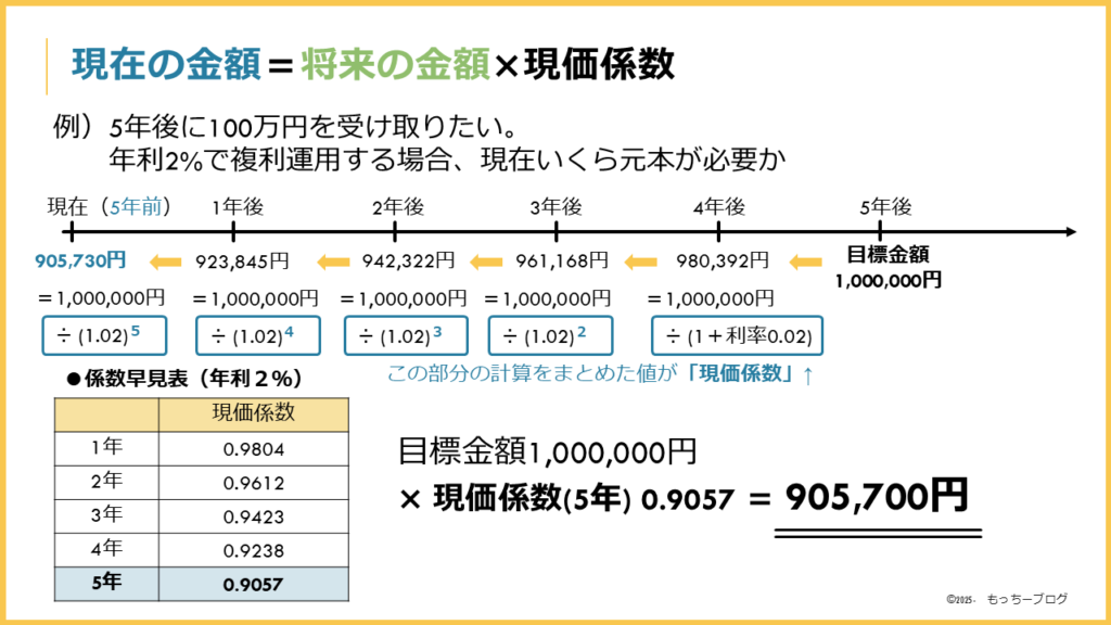 2%の利率で複利運用しながら 5年後に100万円を貯めたい場合に、目標金額100万円×現価係数0.9057現在必要な元金は905,700円と計算できます