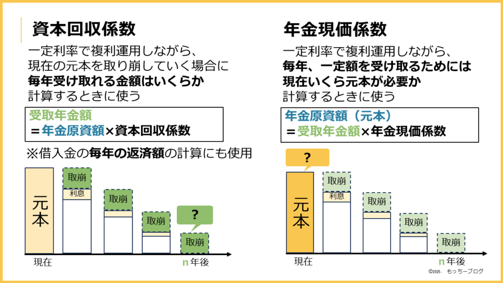 資本回収係数は、現在の元本から毎年受け取れる金額を試算するときに使います。
